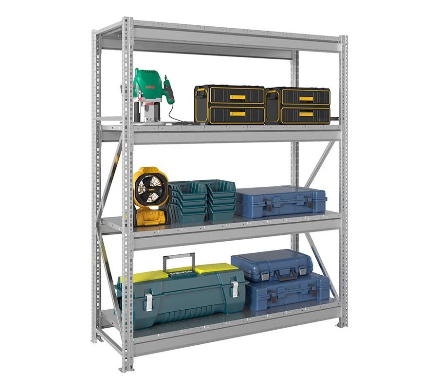Стойки изготовлены из оцинкованного металла. В основе их конструкции – угловой усиленный профиль 56×47 мм с двухсторонней овальной перфорацией, существенно облегчающий монтаж и демонтаж. Шаг перфорации для крепления полок – 50 мм.